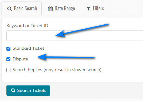 Dispute - If checked, searches dispute tickets. This ONLY appears if the dispute system is enabled in your settings.